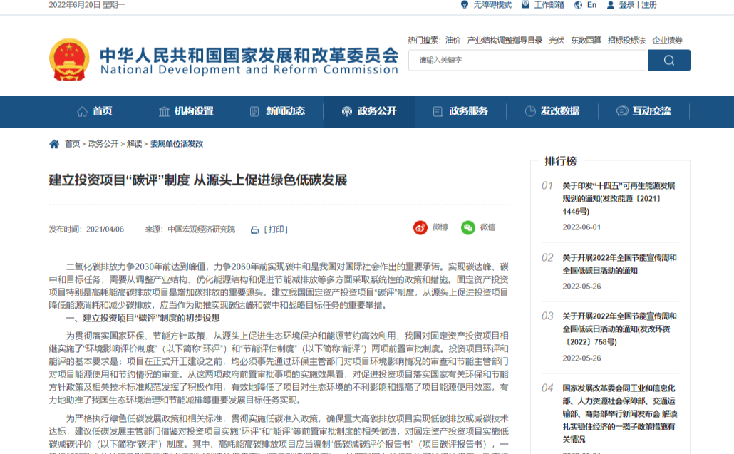 【国家发改委】建立投资项目“碳评”制度 从源头上促进绿色低碳发展
